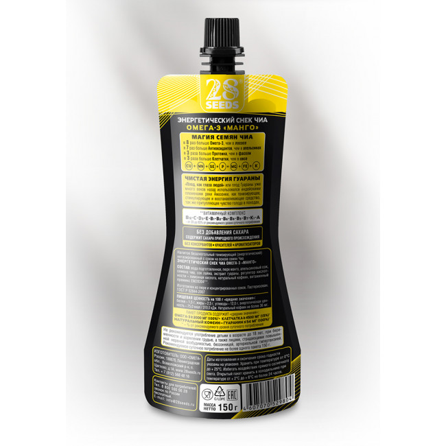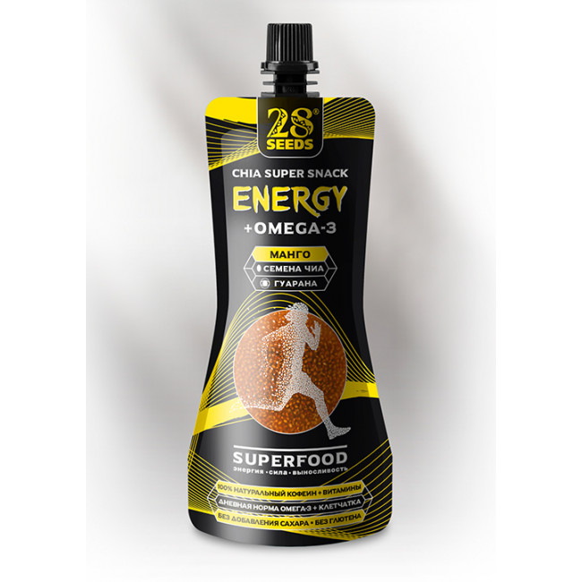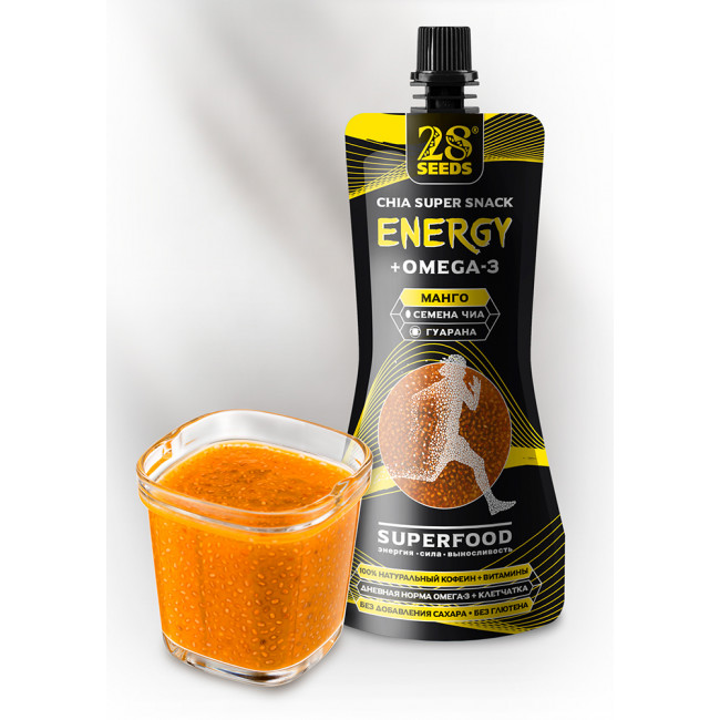Состав: вода, пюре манго, апельсиновый сок, семена Чиа, сок лайма, экстракт гуараны, регулятор кислотности - лимонная кислота, натуральный кофеин, витаминный премикс EM28304