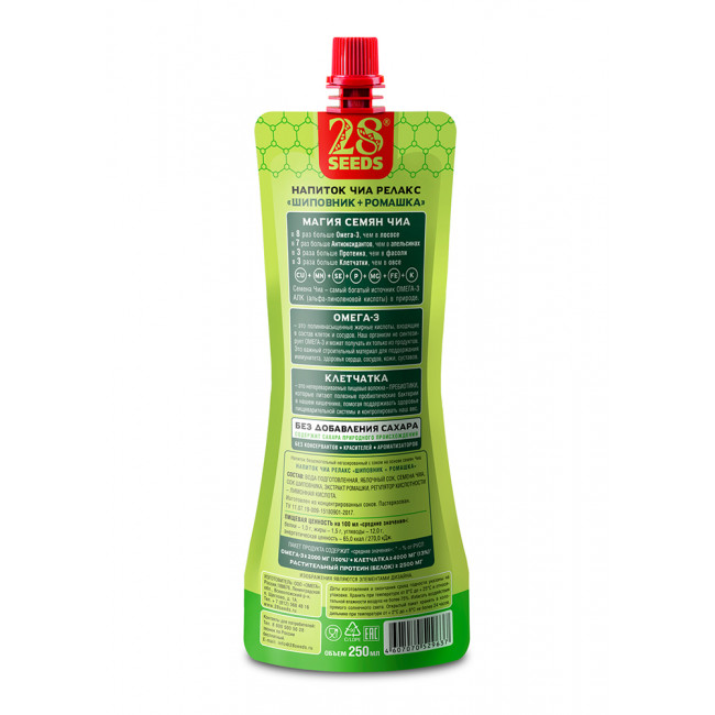 Состав: вода, яблочный сок, семена чиа, сок шиповника, экстракт ромашки, регулятор кислотности – лимонная кислота