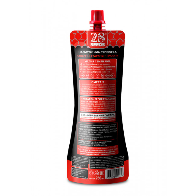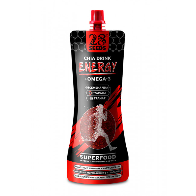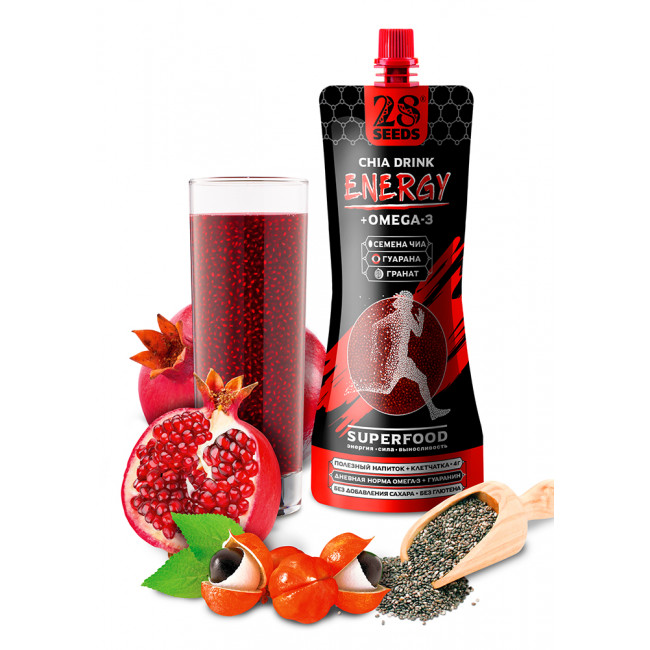 В каждом пакете напитка кроме вкусных фруктовых соков и натуральной энергии гуараны, благодаря семенам Чиа Вы получите полную дневную норму Омега-З плюс 4,0 г диетической клетчатки и 2,5 г растительного белка, антиоксиданты, витамины и минеральные вещества. Вместе эти питательные вещества обеспечат Вас энергией и силой, чтобы жить той жизнью, о которой Вы мечтаете.