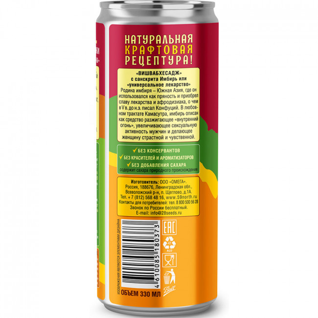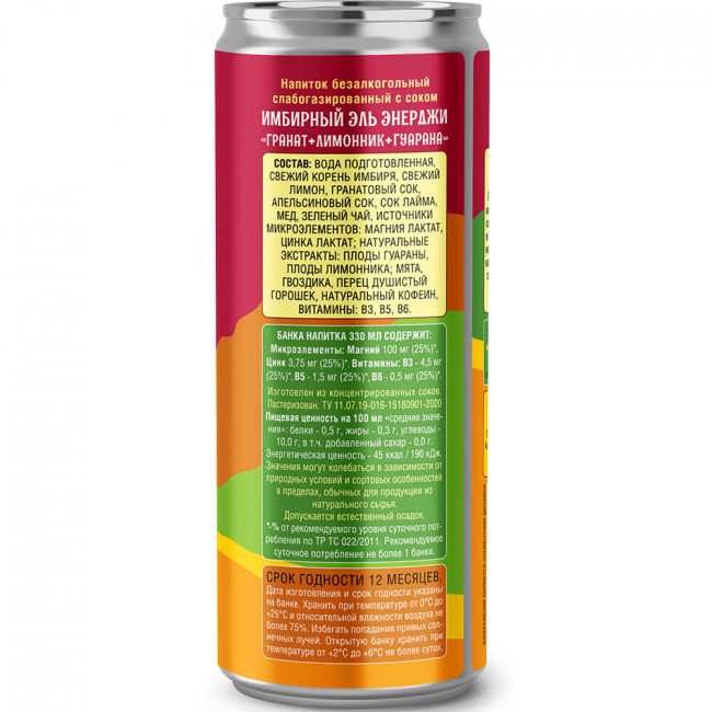 Состав: Вода подготовленная, свежий корень имбиря, свежий лимон, гранатовый сок, апельсиновый сок, сок лайма, мёд, зелёный чай, источники микроэлементов: магния лактат, цинка лактат; натуральные экстракты: плоды гуараны, плоды лимонника; мята, гвоздика, перец душистый, горошек, натуральный кофеин, витамины: B3, B5, B6.