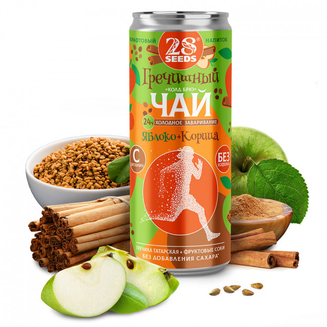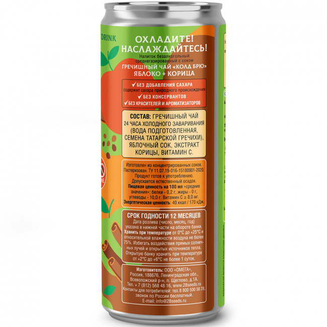 Состав: Гречишный Чай "колд брю" ЯБЛОКО - КОРИЦА: гречишный чай 24 часа холодного заваривания (вода подготовленная, семена татарской гречихи), яблочный сок, экстракт корицы, витамин С.