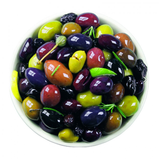 Ассорти лучших сортов греческих оливок больших размеров: Халкидики, Каламата, Золотые, Амфисса, маринованные, с добавлением средиземноморских трав и специй.