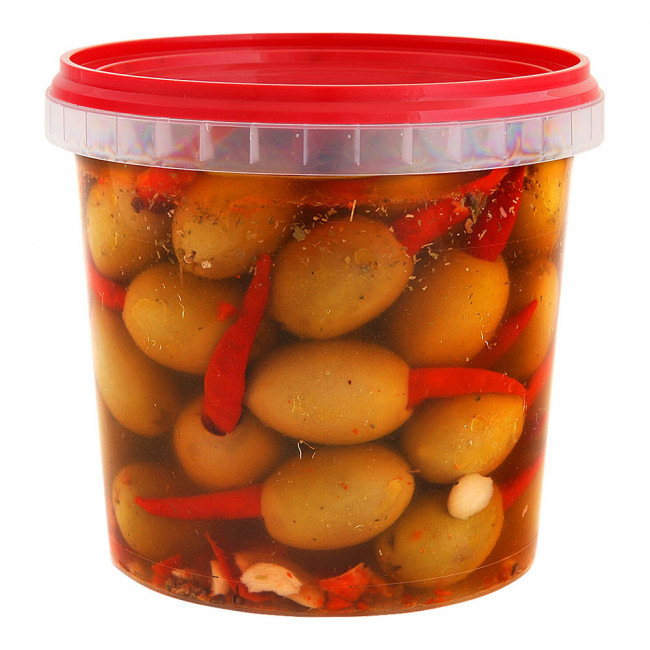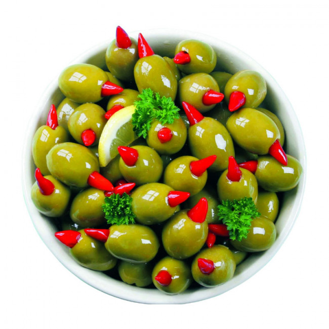 Гигантские греческие оливки Халкидики, размер Atlas (71-90), вручную фаршированные острым красным перчиком Пири-Пири с традиционными специями.