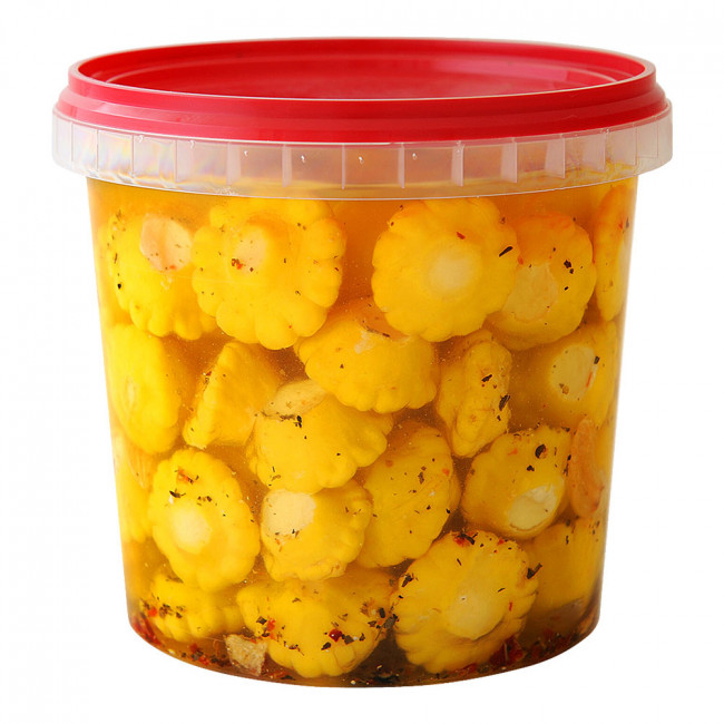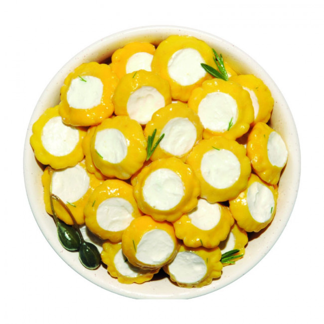 Привлекающее гурманов великолепное сочетание ярко-желтых хрустящих маринованных патиссонов, фаршированных смесью сыра Фета и сливочного сыра с добавлением трав и специй.